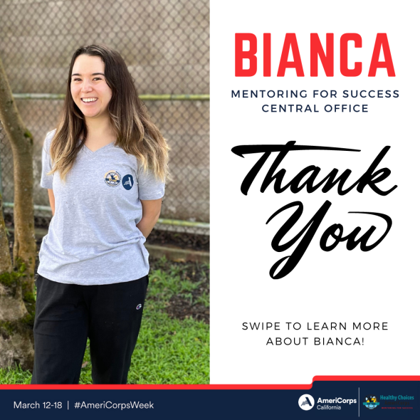 "Bianca is a a valued member of our central team! As a 2nd year AmeriCorps member, Bianca knows firsthand the demands of being at a school site. By supporting centrally, she is seen as a leader among her peers and has provided endless support to the Mentoring for Success program. Bianca is an absolute superstar!"