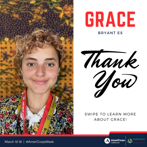 "Grace is the most wonderful human on campus. She is loved & cherished by the children, families and staff at Bryant Elementary. She is a creative genius, arts teacher, stuffed animal-giver, Kimochi-centered, BIPOC/queer/ "homey"/superstar of the year!"