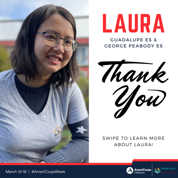"Laura is thoughtful about how to best support students and wants to make Lunch Bunch fun for all students! Her contributions to Guadalupe Elementary, George Peabody Elementary, and her AmeriCorps cohort's team days are appreciated by all who have had the chance to work with her."