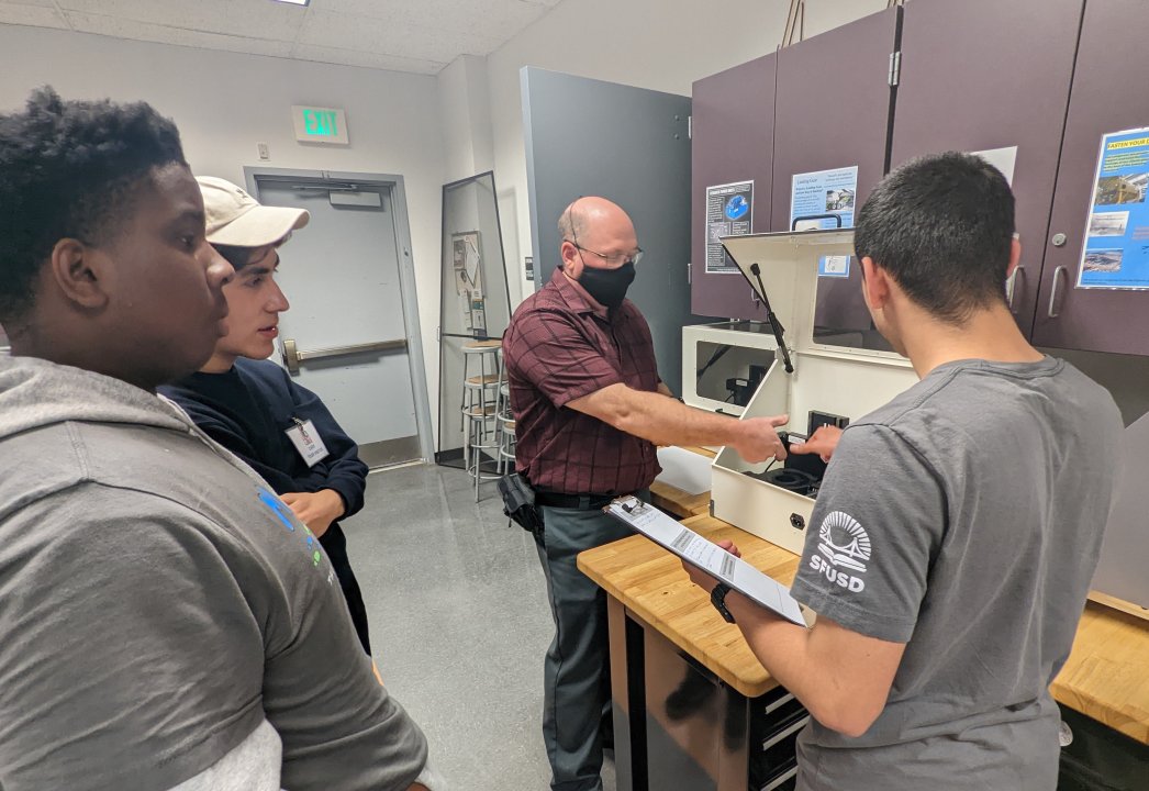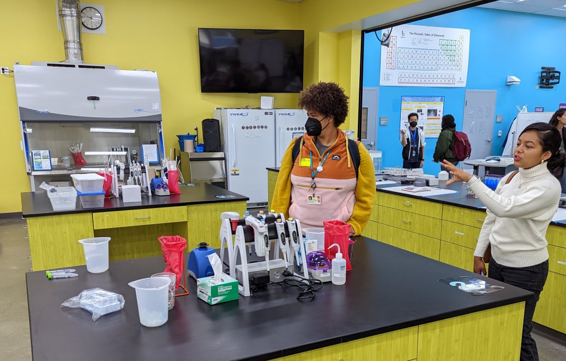 A Student Ambassador investigates the technology at the Science Garage in South San Francisco High School