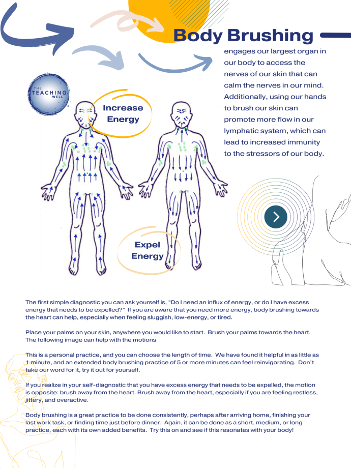 Body brushing engages our largest organ in our body to access the nerves of our skin that can calm the nerves in our mind. Additionally, using our hands to brush our skin can promote more flow in our lymphatic system, which can lead to increased immunity to the stressors of our body. Click the linked images below for a walk-through video and downloadable pdf for this exercise.