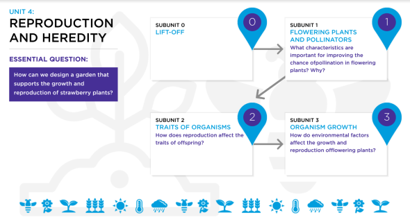 Through investigations, students identify several cause and effect relationships related to reproduction, heredity, behavior, and organism growth. In Subunit 1, students explain how flowering plant structures can increase the chance of pollination. In Subunit 2, students explain how sexual reproduction results in more genetic and trait variation in offspring than asexual reproduction. In Subunit 3, students analyze data from self-designed experiments to determine the effect environmental factors have on the growth of organisms.