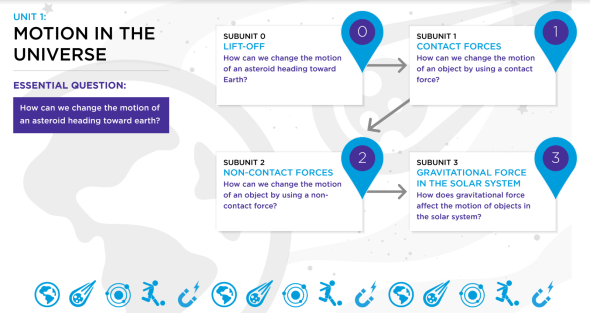 Through investigations, students consider the relationship between forces and motion. In Subunit 1, students gather evidence to support the concept that changes to an object’s motion depend on the sum of the forces acting on the object and the mass of the object. Students use contact forces to design a solution to a problem involving the motion of two objects on a path for collision: Earth and an asteroid. In Subunit 2, students ask questions and construct experiments to determine the factors that affect the strength of electrostatic, magnetic, and gravitational forces. Students return to the problem of an asteroid heading toward Earth, this time considering how a non-contact force might solve the problem. In Subunit 3, students develop a model to describe the role of gravity in the motions of objects within the solar system, including that of the asteroid and Earth.