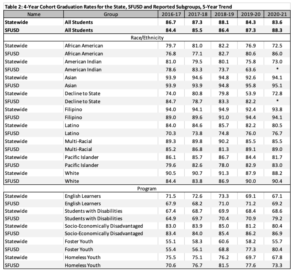 Table 2: 4-Year Cohort Graduation Rates for the State, SFUSD, and Reported Subgroups, 5-Year Trend