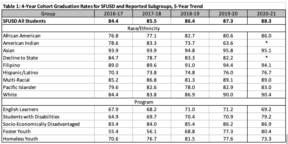 San Francisco (January 10, 2022) – The California Department of Education (CDE) has released its 2020-21 Four-Year Cohort Reports, which include graduation rates. San Francisco Unified School District (SFUSD) cohort graduation rate improved from 84.4% in 2016-17 to 88.3% in 2020-21. The graduation rate in 2016-17 is used as a baseline for comparison due to federal requirements that prompted changes to the calculation of the cohort graduation rate.