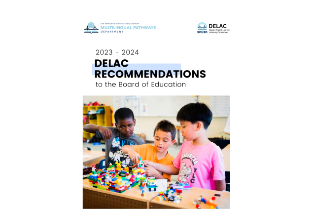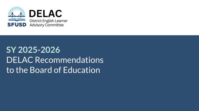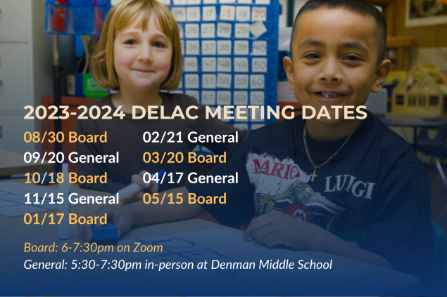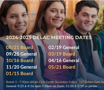 District English Learner Advisory Committee (DELAC) is a committee established in California public school districts with 51 or more Multilingual learners (ML). Its purpose is to advise the Board of Education on matters related to English language development programs and services for Multilingual learners. DELAC includes representatives from school site English Learner Advisory Committees (ELAC) and serves as a forum for parents and guardians of Multilingual learners to express their perspectives and offer input on the Multilingual learner programs and services provided by the district.