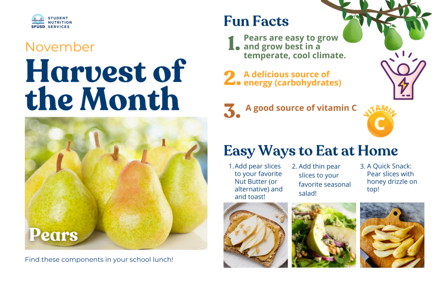 November means Pear season! You can pick them, slice them, and bake them, they are so versatile! Download this printable poster to share the simple and fun ways to incorporate Pears into meals and snacks at home. Pears are a great source of vitamin C and their carbohydrates help give you energy!