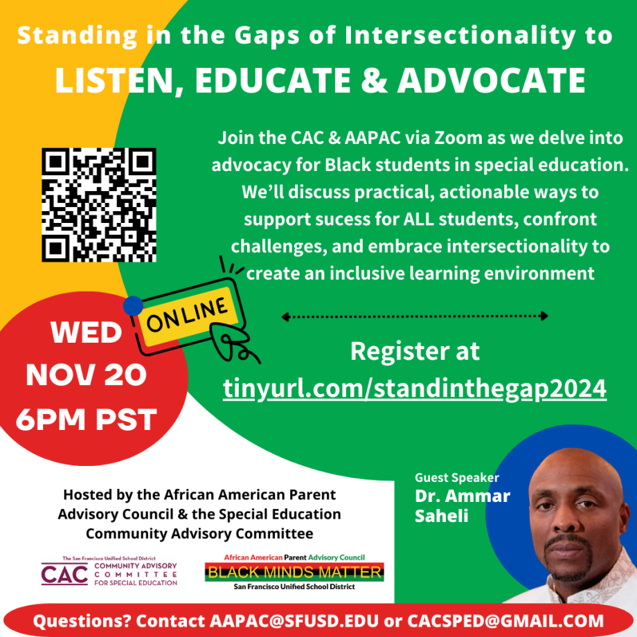 Join AAPAC and the CAC via Zoom as we delve into advocacy for Black Students in Special Education. We'll discuss practical, actionable ways to support success for ALL students, confront challenges, and embrace intersectionality to create an inclusive learning environment.