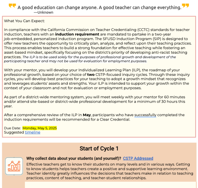 SFUSD offers a free-of-cost accredited induction program to obtain a California clear teaching credential. SIP Induction is a two-year job-embedded program that provides teachers with a coach and supports them through an Individualized Learning Plan.