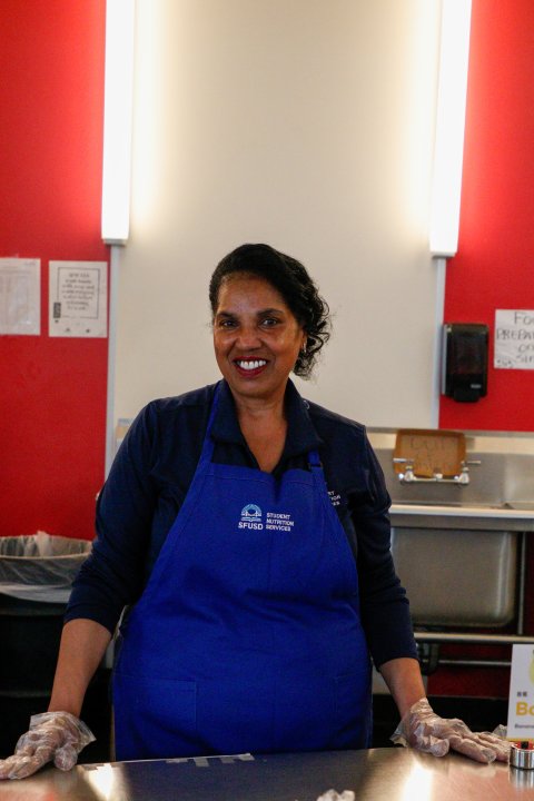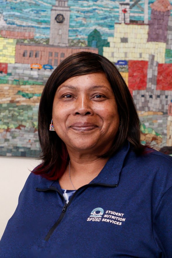 Valerie’s over 20 years of service with Student Nutrition Services, now at Commodore Sloat Elementary, all began because she was sought after by someone from SNS at the time who saw her warm and welcoming demeanor and knew she would make an impact in School Food. Now, Valerie is a seasoned pro who especially takes pride her food presentation, making it neat and inviting for students, and then seeing which meal options they like most. If you ever happen to get to take a look into Valerie’s day to day role, you’ll see that she’s efficient, hard working, and a positive impact in her school community!