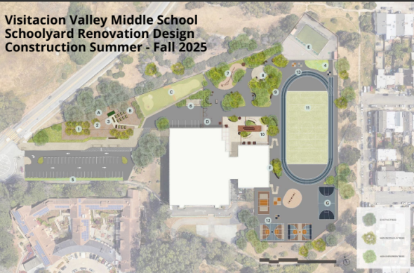 This project reimagines the entire schoolyard of Visitacion Valley Middle School, adding a variety of shade, stormwater management, and bioretention features, in addition to outdoor classroom and play area improvements. It is funded by the Bond Program, San Francisco Public Utilities Commission, and CAL Fire, and was designed with input from school staff, students, and community members. The new yard will include a turf soccer field and track, an outdoor kitchen, gardens and nature areas, an amphitheater, and refreshed striping for a range of sports and activities.