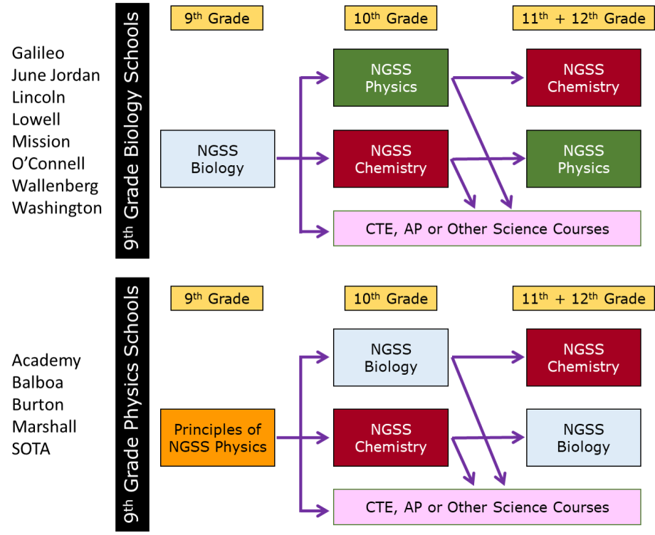 At each high school, all 9th grade students will take the same science course, either NGSS Biology or Principles of NGSS Physics. No other science options are available at 9th grade. The school-wide decision of the 9th grade science course determines the sequence of course options in grades 10-12. Galileo, June Jordan, Lincoln, Lowell, Mission, O’Connell, Wallenberg, and Washington offer Biology in the 9th grade. Academy, Balboa, Burton, Marshall, and SOTA offer Principles of NGSS Physics in 9th grade.