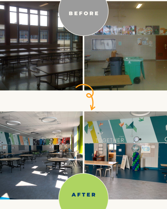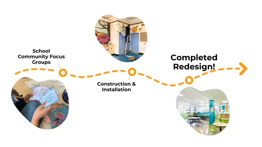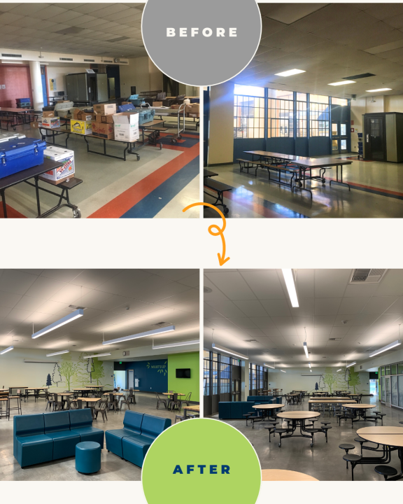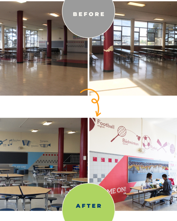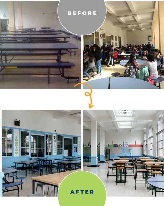 All redesigned dining spaces went through the same process. First, our team conducted school community focus groups to collect student and staff input on what they would like to see and feel in their dining space. Next, our contractors got to work on constructing and installing new design elements. Lastly, we celebrate a completed student-centered dining space redesign!