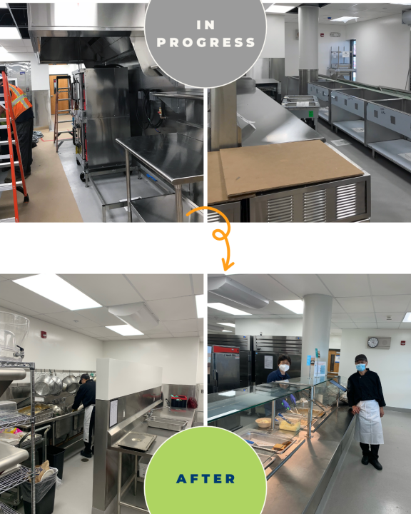 Updated in 2019, the kitchen renovation created the capacity and infrastructure to enable our dining team to upgrade the quality and freshness of food served. The dining space redesign helped create a welcoming and dignified space where students want to spend time. Both of these elements came together to elevate the student dining experience to the level we strive for.