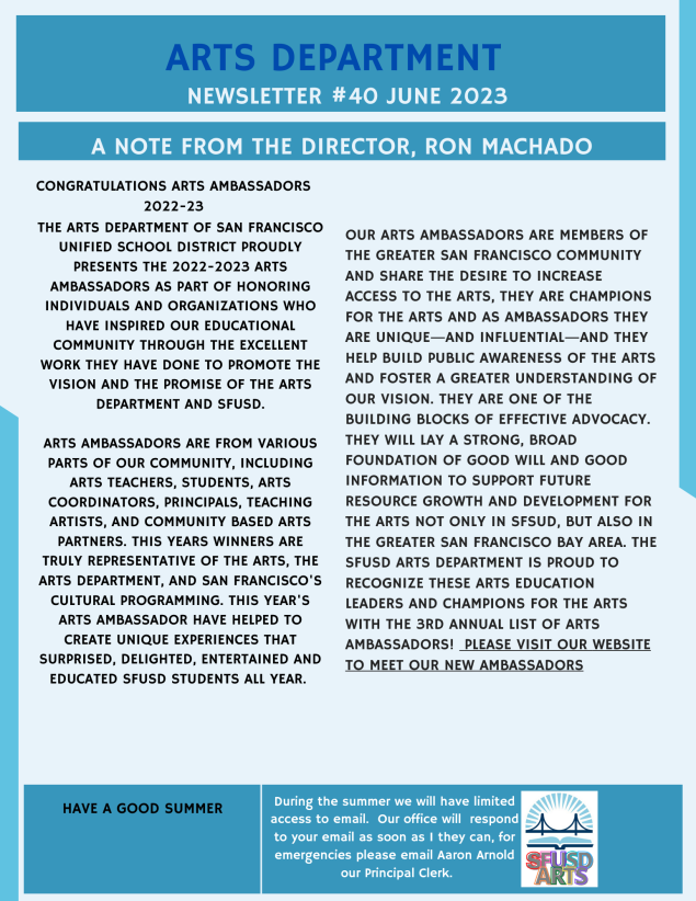 Ron Machado, SFUSD Arts Department Director MachadoR@sfusd.edu