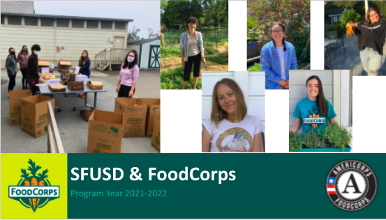 FoodCorps is a rapidly growing program at SFUSD! Starting only 2 years ago with four members, we are now expanding to seven positions. Five service members will be working at elementary schools, one at a new middle school position, and one returning member will be continuing their service at Student Nutrition Services. In collaboration with the Student Engagement Coordinator, we developed a School Food Advisory position for student voice at the Middle School level that will co-facilitate Middle School Student Outreach Worker group. In alignment with SFUSD Good Food Purchasing Policy and Wellness Policy, we expanded Farm to School Procurement District-wide, with a specific focus on the McAteer Culinary Center.