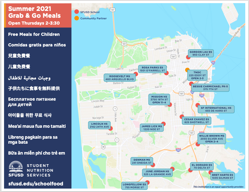 Is your student attending an in-person SFUSD summer program? Your Grab & Go meal bag will have 2 days worth of meals. All students attending in-person summer programs will be offered a healthy lunch and hearty snack at school.
