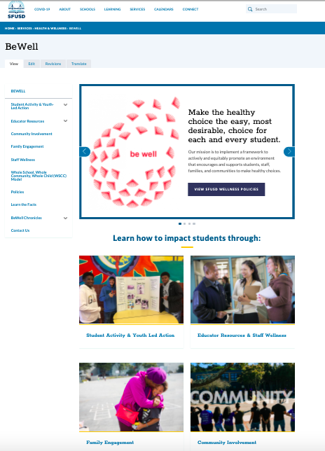 SFUSD's Wellness Policy provides all schools and district offices a framework to actively promote the health and wellness of students, staff, and families. Our approach to well-being is aligned with the Whole School, Whole Community, Whole Child model and informed via a racial equity schema. The policy is meant to inspire and empower a shift in culture and environment that will encourage our communities to make healthy choices.