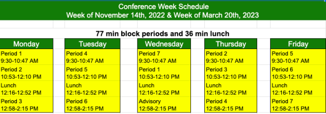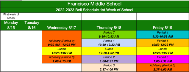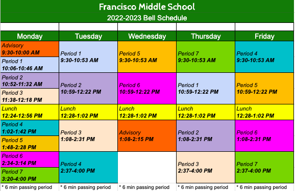 FMS Bell Schedules 2025 - 2026 Link to this section Regular Bell Schedule Regular Bell Schedule Monday Holidays Bell Schedule Labor Day, Indigenous People's Day, MLK Day, President's Day, Memorial Day Monday Holidays Bell Schedule Conference Week Bell Schedule Week of Nov. 17th and Week of March 2nd Conference Week Bell Schedule Friday Holidays Bell Schedule Spring Recess Friday Holidays Bell Schedule This page was last updated on August 14, 2025