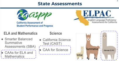 The Initial AND/OR Summative Alternate ELPAC tests are administered to kindergarten through grade twelve students up to age 22 with the most significant cognitive disabilities who have an English Language Acquisition Status of English learner and who have been determined eligible to take alternate assessments by an individualized education program (IEP) team. A current, affirmed IEP must specify Alt ELPAC for Initial and Summative. A Decision Confirmation Worksheet must be used by the IEP team determine eligibility. The test must be administered by a certified (annually), site-based teacher who works with the student and understands their communication style.