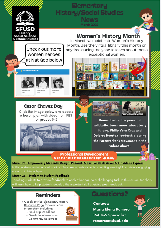 Students in SFUSD engage in daily social studies instruction (through both integrated and stand-alone units). As our department explores curriculum, we are providing access to our extended pilot of three, 5-7 week stand alone units from InquirED's Inquiry Journeys for each grade level that can alternate with Science units during the year. We're currently in an extended pilot potential curricula. The extended pilot allows teachers to have early access until an adoption can be finalized. Due to our District's financial budgetary constraints and making sure that teachers can focus on the newly adopted math curriculum, it was not be feasible to get to adoption for this school year. However, our team is committed to trying to provide ongoing social studies resources to teachers across K-5. Social Studies instruction prioritizes building a strong foundation in community and the understanding that every community member (citizen) has a voice in the ways our communities function and are built. We explore history/social studies as windows to the past and present while working together to intentionally build a classroom community rooted in the SFUSD Humanizing Values. Link to this section