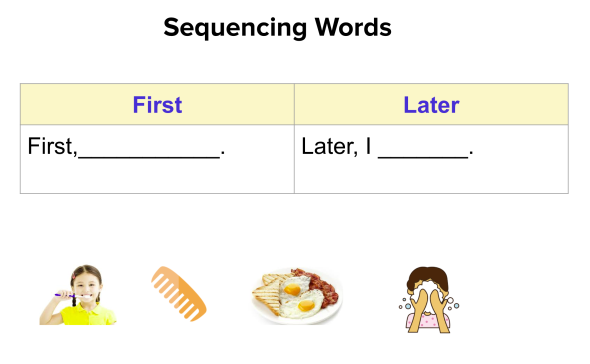 - Text Structure: Structure of the text, pronouns, and transitional words & text connectives (e.g. first/next/then, last/finally, after, then, one day)