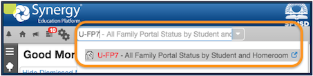 Run the U-FP7 Family Portal Status by Student and Homeroom report.