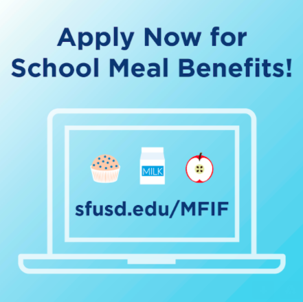 Resources Link to this section Basic Needs Available to Students and Families Meal Benefits for the 20-21 School Year Apply for your student to receive free or reduced-price school meals Click here to apply SFUSD Grab & Go Meals SFUSD Nutrition Services Click here to get information SF - Marin Food Bank Pop Up Pantries Produce, protein, grains and other items Find a Pop-Up Pantry near you St. Anthony's To-Go Meals Each guest will be limited to one pre-packaged meal Click here to learn more San Francisco Food Resources Resources and Information including WIC, CAL Fresh and where to get food Click here This page was last updated on September 12, 2020