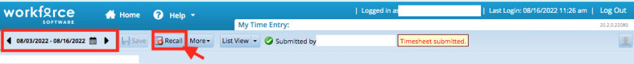 - Click the Recall button. A message shows up stating that the timesheet is recalled.