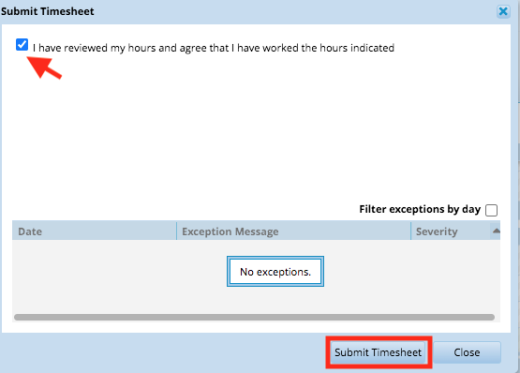 - A popup window appears. Check that you have reviewed and agree that you have worked the hours indicated. Click Submit Timesheet.