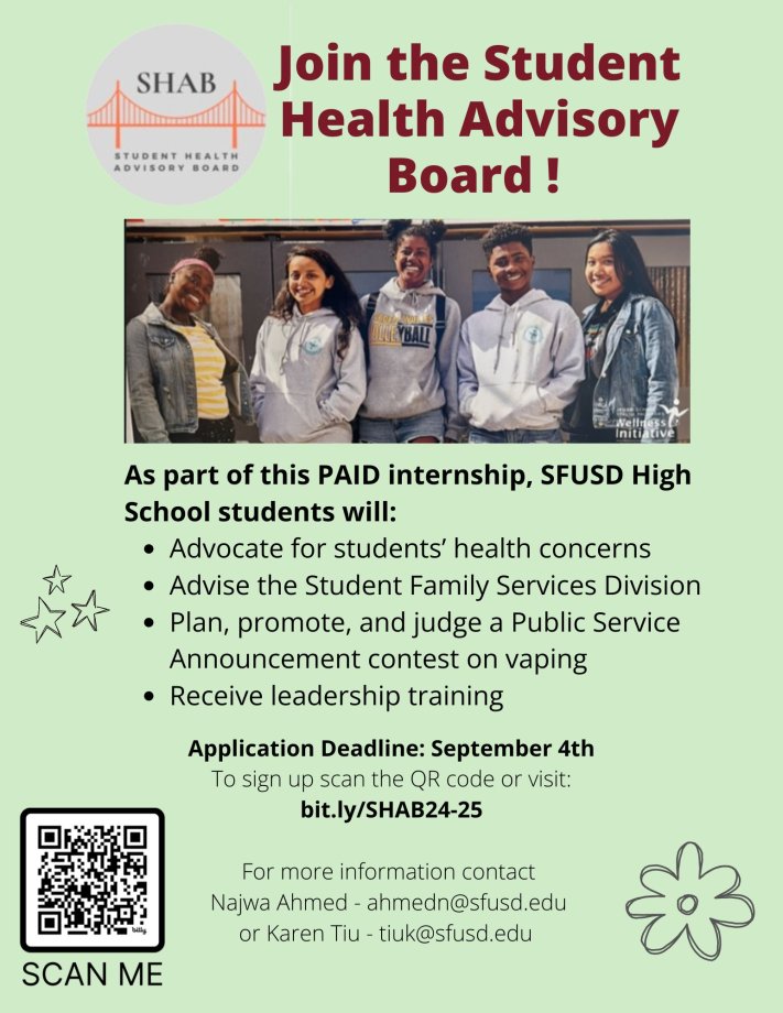 Student Health Advisory Board (SHAB) consists of 10-15 high school students who work with the Student Family Services Division to promote safe, healthy and affirming school environments for students across the district. SHAB members come from different public high school across San Francisco. Their mission is to bring awareness and educate others of the health disparities of tobacco use through the Public Service Announcement contest and promote healthy choices.
