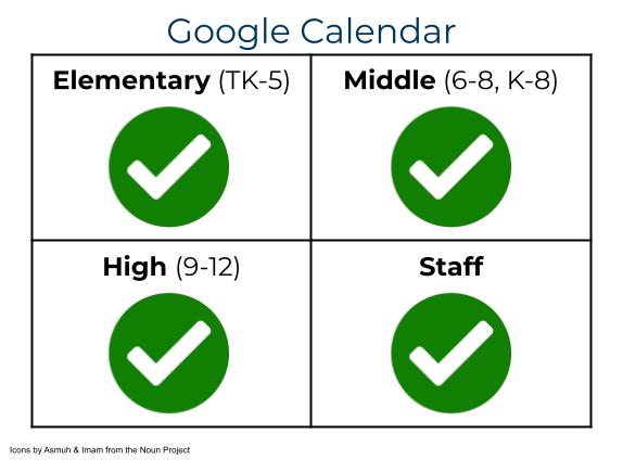 All staff and students in SFUSD have access to Calendar to create events and RSVP to events. Only SFUSD staff can add Meet links to a calendar event, but students can join Meets created by a staff member.
