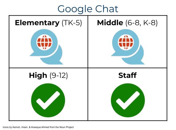 Google Chat is an instant messaging tool, and it is available for use by SFUSD staff, high school students (grades 9-12), and students in grades 3-8 at sites where administrators have requested its access for students.