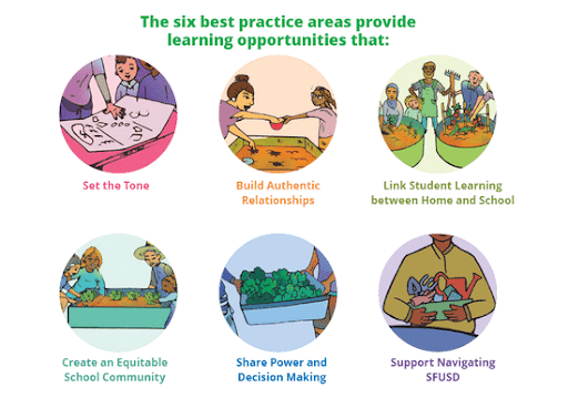 The SFUSD Family Partnership model outlines six best practice areas that will support you in bringing authentic and long-lasting family partnership to your site. The best practice areas are as follows: Set the Tone, Build Authentic Relationships, Link Student Learning Between Home and School, Create an Equitable School Community, Share Power and Decision Making, and Support Navigating SFUSD.
