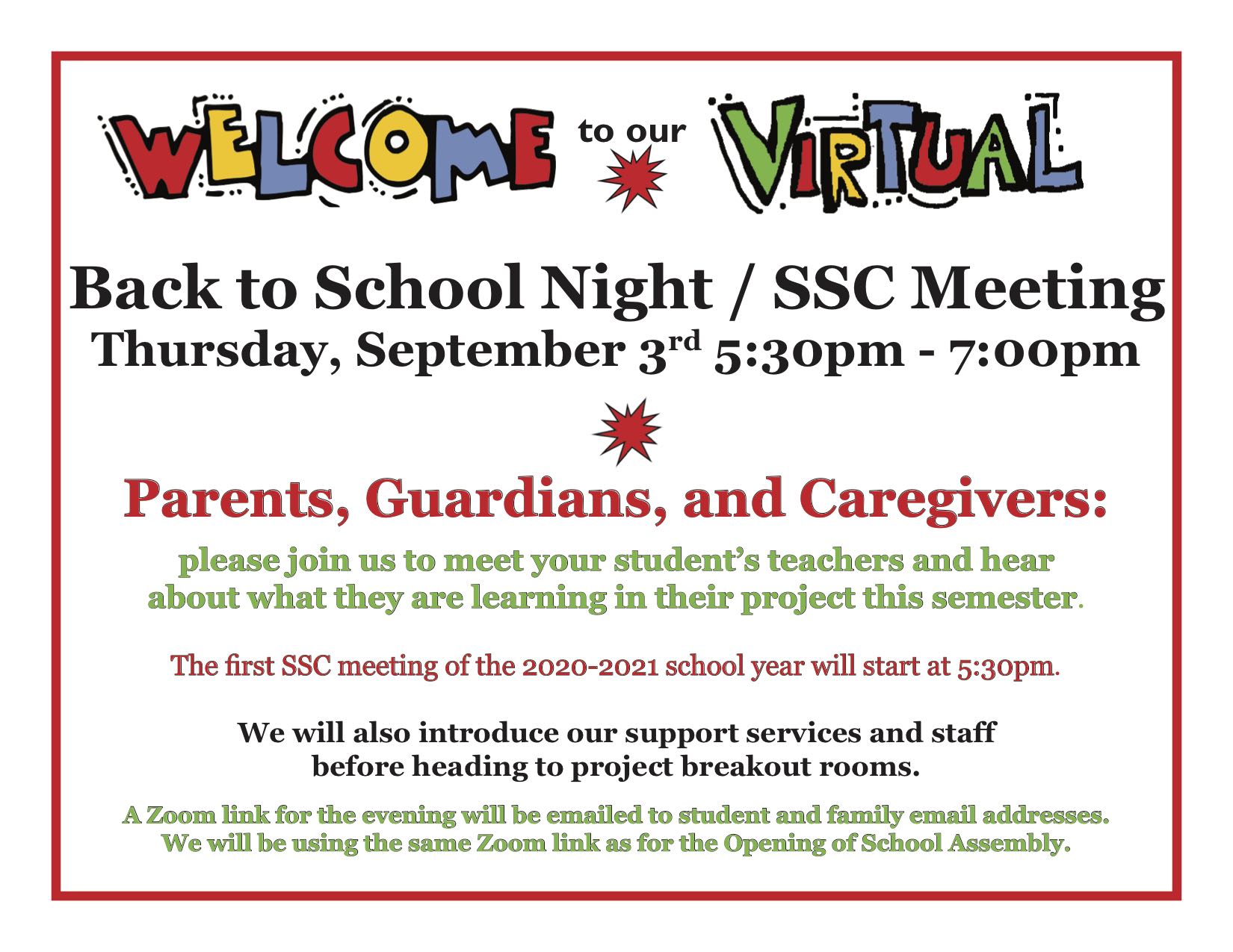 Virtual Back to School Night / SSC Meeting Thursday, Sep. 3 5:30pm - 7:00pm