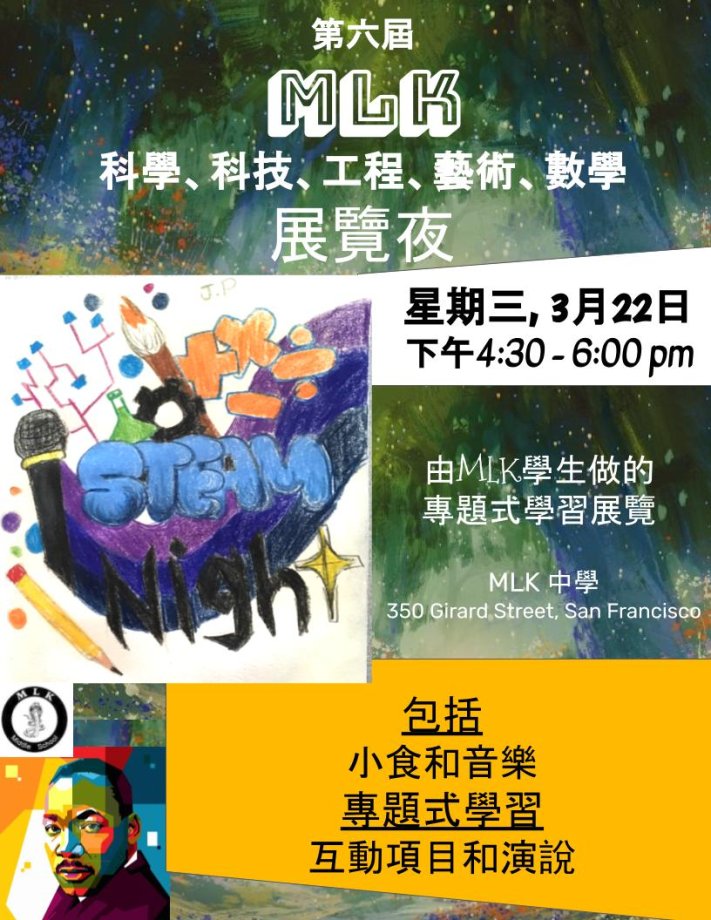 MLK MS:下星期會議:校務決策委員會會議 (SSC)3/21,MLK科學、科技、工程、藝術、數學 展覽夜 3/22,MLK MS 家長教師協會 (PTA) 信息/組織會議 3/23
