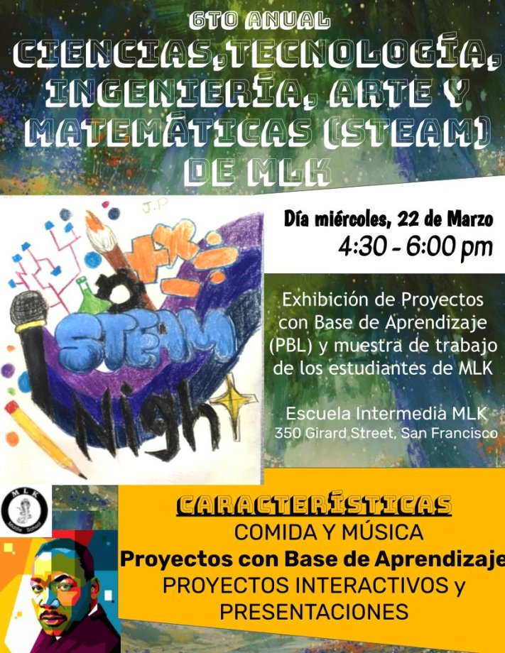 MLK MS will be holding 6th Annual MLK STEAM NIGHT on Wednesday, March 22 at 4:30 - 6:00 pm. Come see Project Based Learning Exhibition & Work Showcase by the students of MLK.