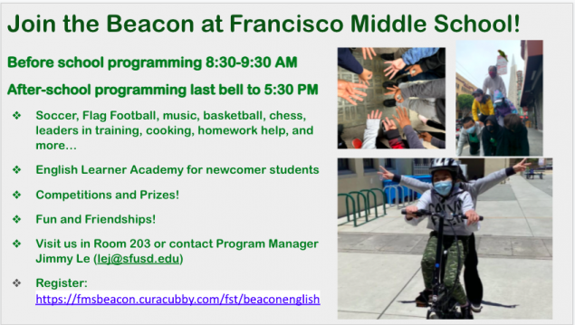 Beacon TEL HI is an integrated community partner at Francisco.  They provide academic and social emotional support to our students before and after school, during the school day, and in the summer.  They also provide important resources to our families.