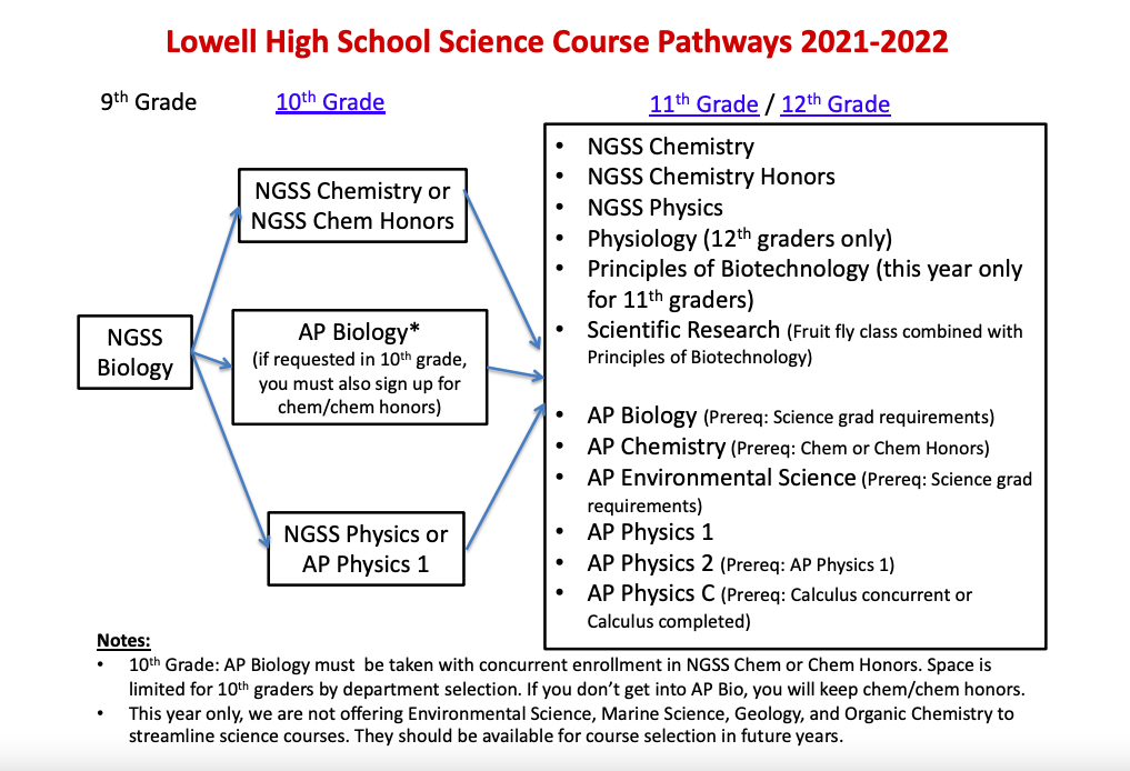Reminder: SFUSD requires students to take at least one year each of biological and physical science. In addition to this, the UC and CSU systems strongly recommend that students take a third year of science before graduating from high school.