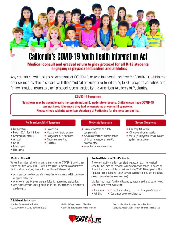 The State recently passed AB 856, the COVID 19 Youth Health Information Act. The Act requires the Department of Education to post on its website information related to the safe return of pupils to exercise and physical activity after exhibiting signs or symptoms of, or testing positive for, COVID-19. The Act also encourage schools and school districts to give pupils and their parents and guardians ready access to this information.