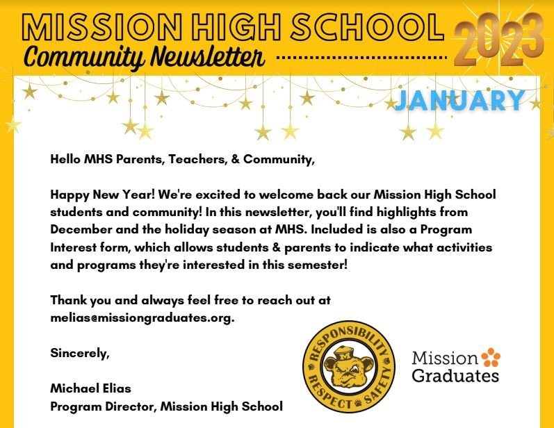 A newsletter that highlight student events, announcements, and resources as well as the work that Mission Graduates is doing with the MHS community is released monthly. Please check the school announcement page for the recent and previous newsletters.