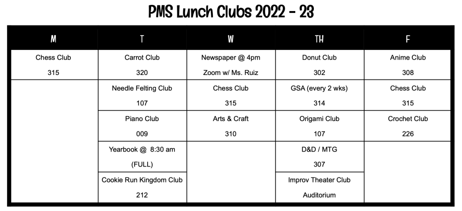 All clubs at Presidio are student led. Students will complete a google form to request the opportunity to start a club request a staff advisor and classroom. Forms will be posted in grade level google classrooms and in the Presidio Family Newsletter when ready.
