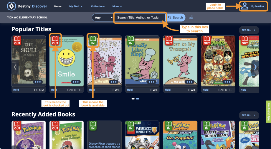 Destiny is our library card catalog, which is a website that lists all the books that we have in the library. It tells us where to find a book in the library, as well as which books are currently available and which ones are currently checked out.