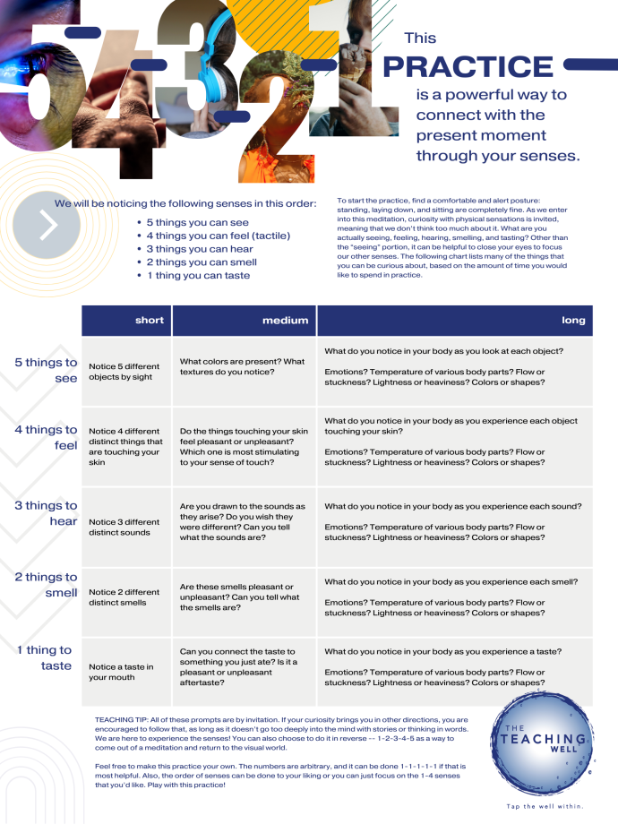 Mindful eating can be done by practicing something akin to 5-4-3-2-1. By activating the 5 senses, we can make every meal a meditation if we slow down enough to become aware of the felt sensations of eating. Click the linked images below for a walk-through video and downloadable pdf for this exercise.