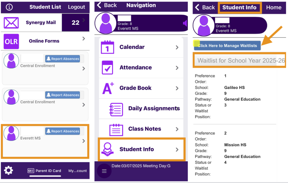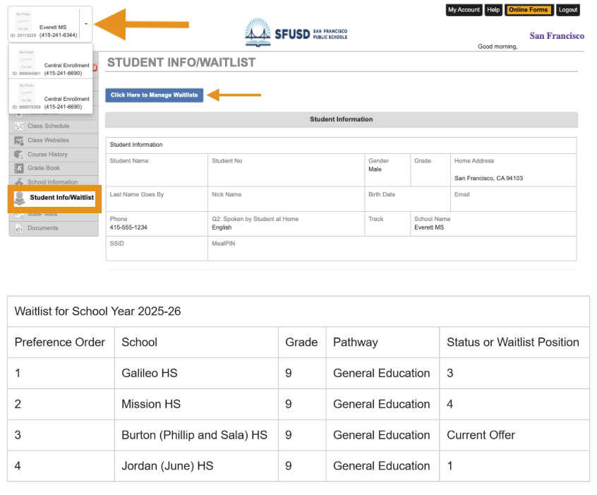 From ParentVUE home screen To check your Waitlist Status Select a student “Waitlist for School Year 2025-26” Here you will see Enrollment offers. To make changes, select “Click here to Manage Waitlists” at the top of the page. |
