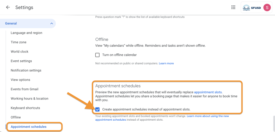 Go to Google Calendar and click on the settings gear in the top right corner. On the left bar, click on "Appointment Schedules", and check the box to switch from slots (old) to schedules (new).