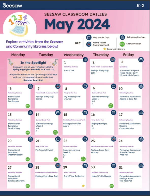 As always, teachers can find fun and ready-to-go activities for each school day in Seesaw’s May Dailies calendar. This month’s calendar features May Special Days, Mental Health Awareness, and much more!