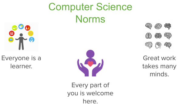 At times, students and teachers may approach computer science with some trepidation. They may think that this subject is not for them or that it may be too difficult. We’ve established these norms to help students and teachers feel welcomed and valued as whole people in their CS classroom. By doing this, we are attempting to mitigate pre-existing stereotypes students and teachers may have about Computer Science or themselves as they begin their CS journey.