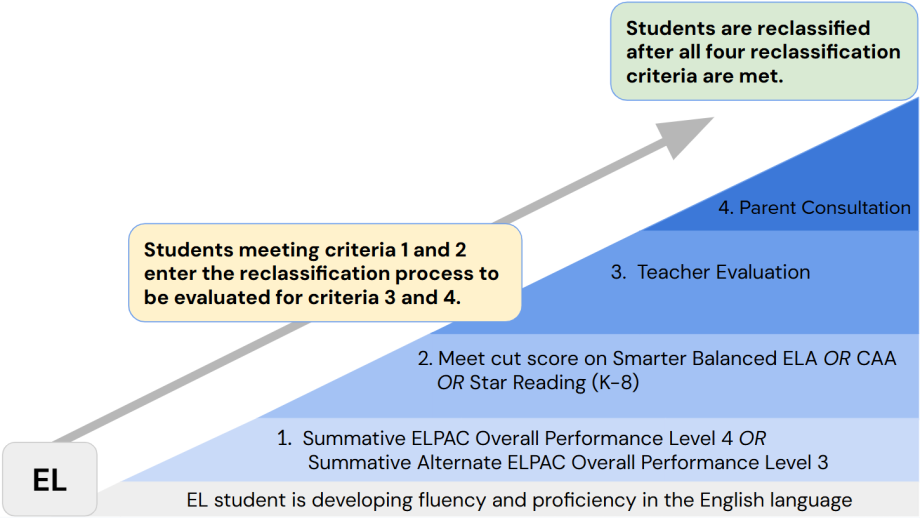 Students become eligible to begin the reclassification process after meeting Criteria 1 and 2. The process is completed after Criteria 3 (Teacher Evaluation) and 4 (Parent Consultation) are fulfilled.