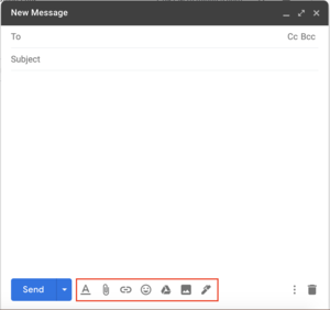Gmail compose windowCompose new email window - This window pops up when you click the compose button (see above). You'll need to enter the email address of the person the email should be sent to, and it's very helpful to include a subject line to let the receiver know what the email is about.